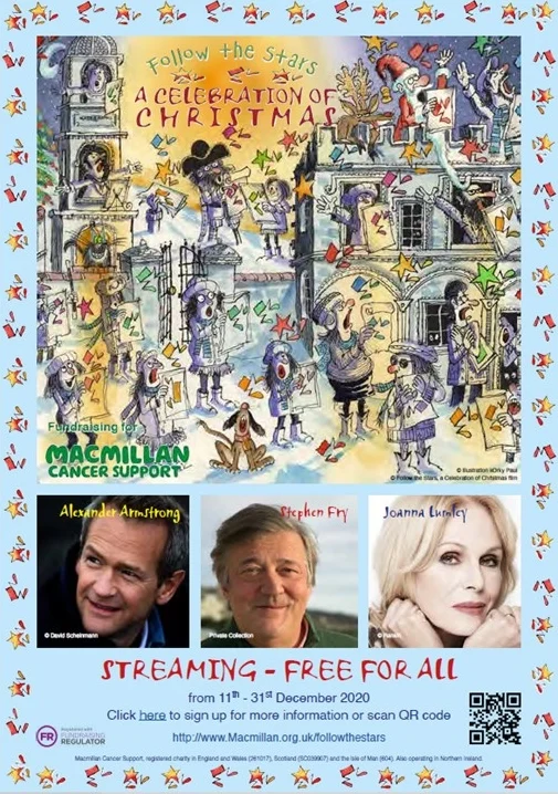 The event will go live on 11th December at 8pm and we hope that many of you might take the opportunity to enjoy this special performance and that it will bring cheer to you, your family, and friends. Follow the Stars will be available online for 30 days after this date, and if you are inclined to support Macmillan there will be a donation link on the screen.